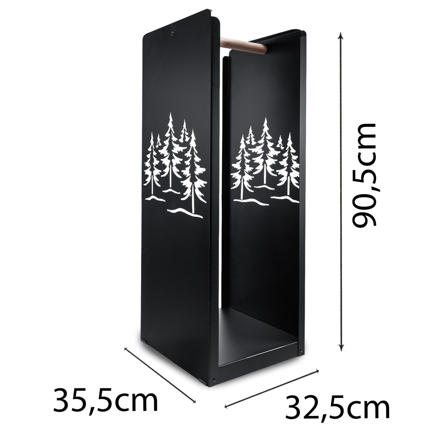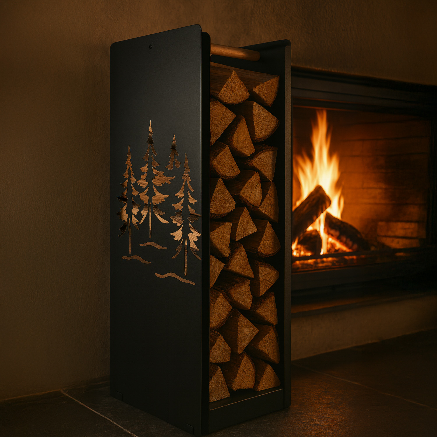 Das besondere Highlight: Ein beidseitig in das Metall gelaserter Wald, der dem Kaminholzlager eine edle, rustikale Note verleiht. So wird dein Holzvorrat nicht nur praktisch, sondern auch dekorativ präsentiert.